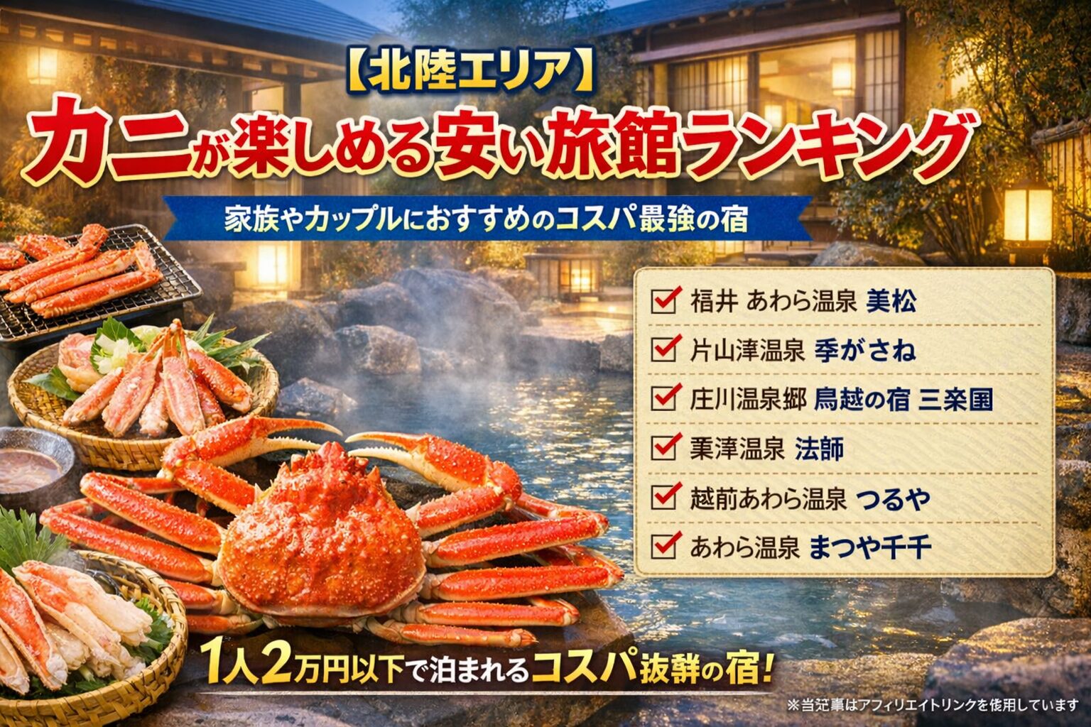 また、この記事では「1泊2食付き・カニ料理ありで、1人あたり2万円前後〜泊まれる宿」を安い旅館の基準としています。